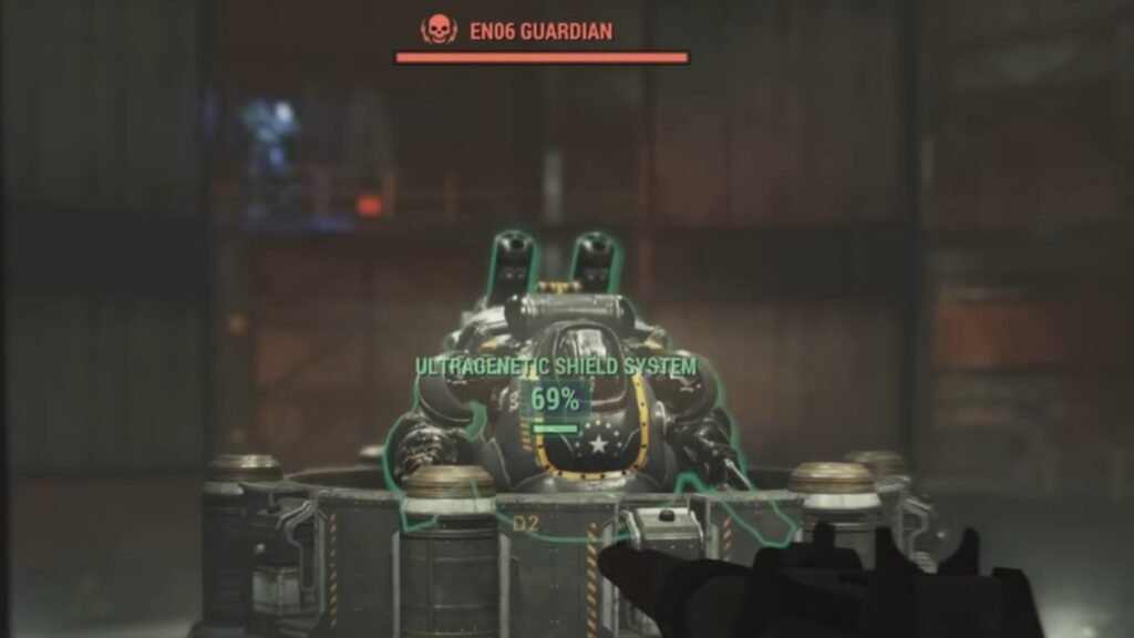 要开始与 ENO6 守护者战斗,你必须按下平台附近的红色按钮。如果你没有好的盔甲,这个机器人可以在几分钟内轻松杀死你。