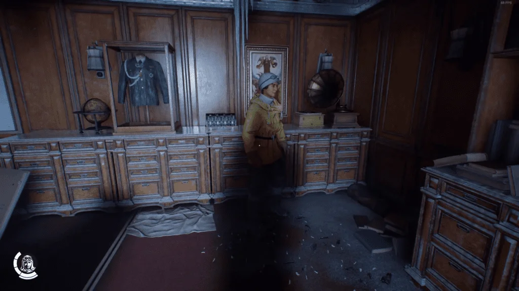 在同一个房间的左墙上,您会看到一个密码机,旁边有一个玻璃盒子里的一套西装。拿出相机拍照。现在取出地板上的所有密码机零件并将它们放回密码机中以激活它。