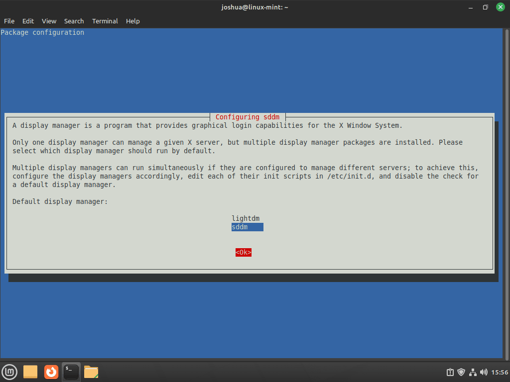在安装过程中,您可能会看到一个提示,要求您配置显示管理器。KDE等离子体最适合SDDM,建议作为默认显示管理器。