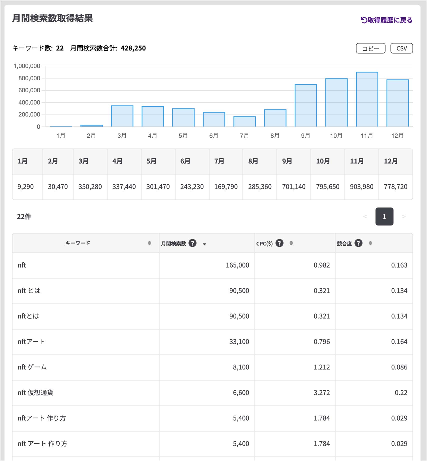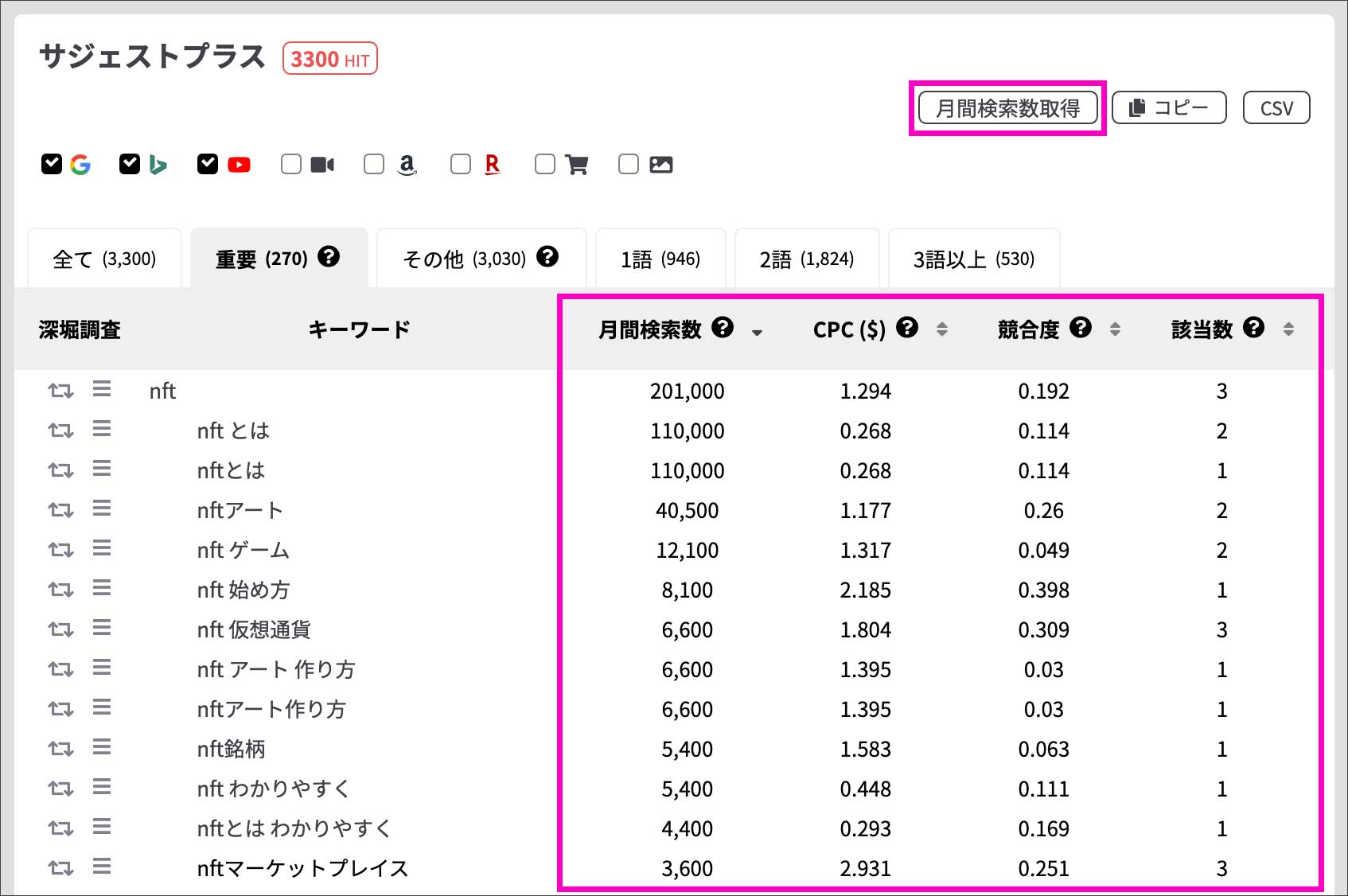 还有什么,建议加单击结果顶部下方的按钮。一键点击只要通过做每月搜索量” 即可获得!而且,它会自动将搜索结果按搜索次数降序排列!