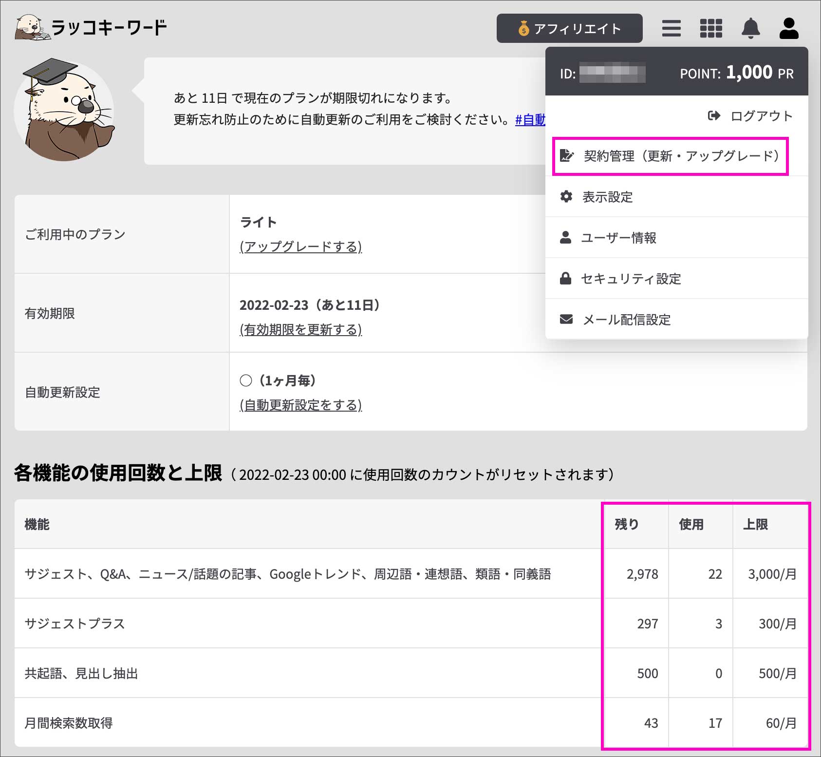 各功能的使用次数及上限可在账户菜单中查看。契约管理“ 页。